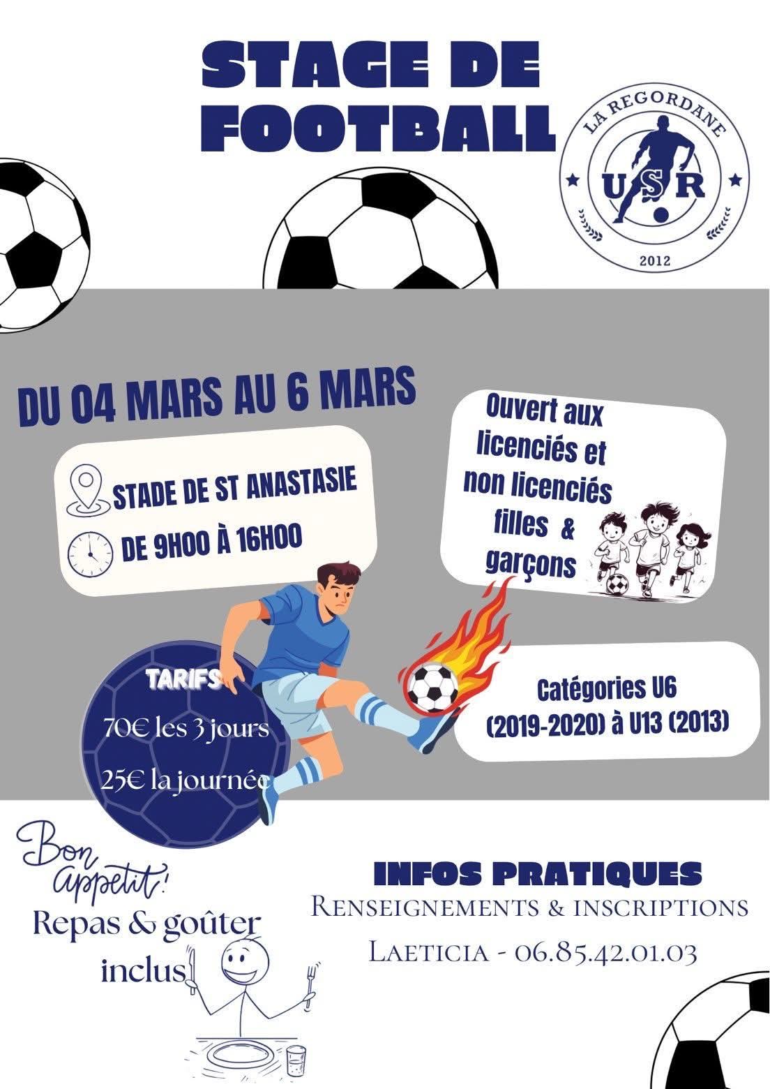 Prochain stage de football gratuit avec repas de midi et goûter organisé par le Club de la REGORDANE du 04/03/2026 au 06/03/2026 (3 jours) de 09h00 à 16h00 au stade Jeremy LLOBET- Espace Paul MAUBON.